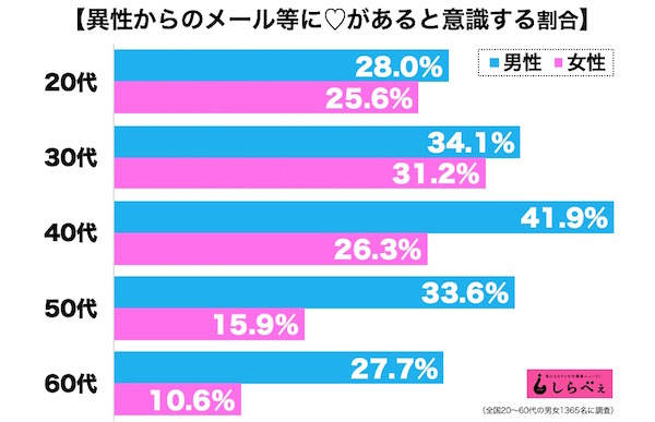 たとえば、「異性からのメール等にハートマークが使われていると、もっとも意識してしまうのは40代男性でおよそ4割」という結果に。