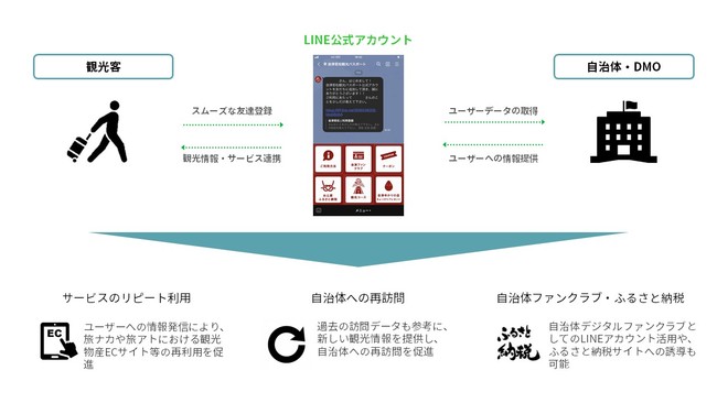 本実証実験はこのような観光地マネジメントの課題解決を目指し、「デジタル観光パスポート」を通じて現地の観光情報提供による「周遊促進」、クーポンの提供による「消費促進」、SNSでのつながりによる「関係人口化」を図り、あわせてユーザーの行動をデータとして蓄積することを目的とするものです。