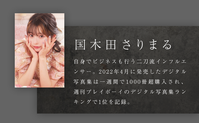 自身でビジネスも行う二刀流インフルエンサー。2022年4月に発売したデジタル写真集は一週間で1000冊超購入され、週刊プレイボーイのデジタル写真集ランキングで1位を記録。