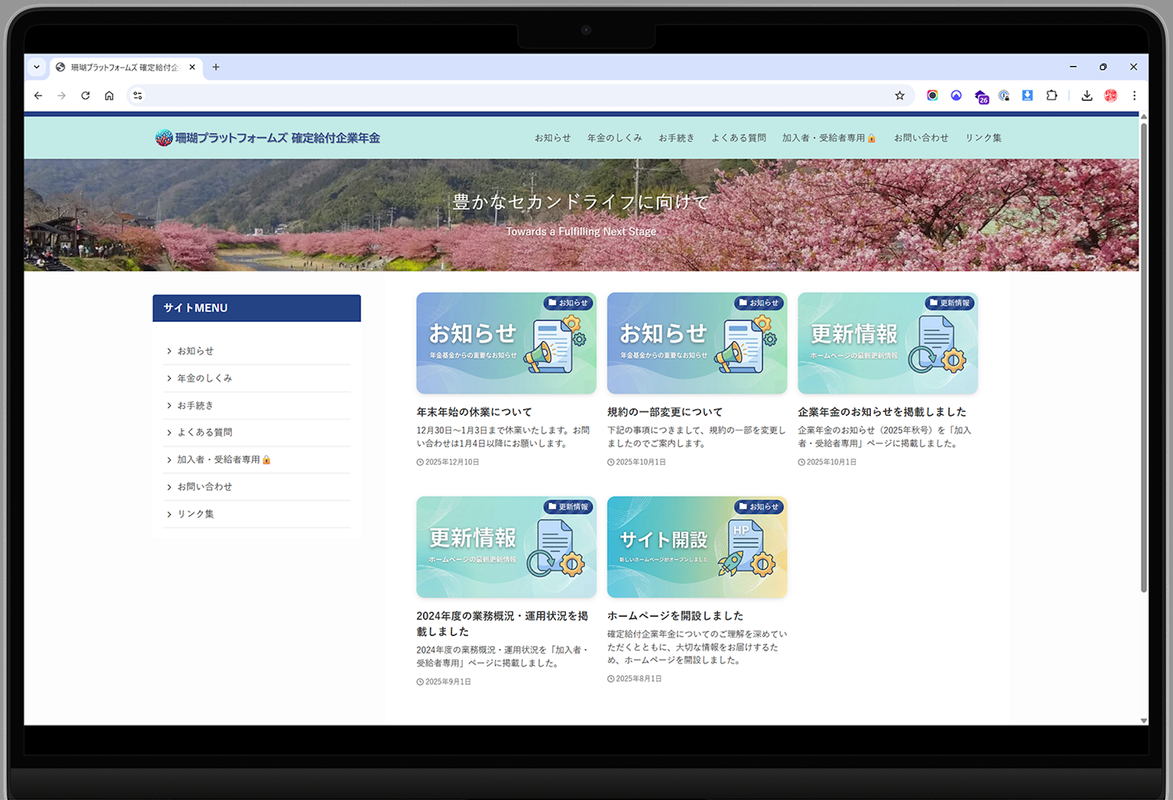 本サービスでは、規約型企業年金を実施している事業主向けに、企業年金制度の内容を分かりやすく伝えるためのホームページの企画・制作・運用を一体で提供します。※本サービスは主に規約型企業年金を対象としていますが、基金型についても対応可能です。