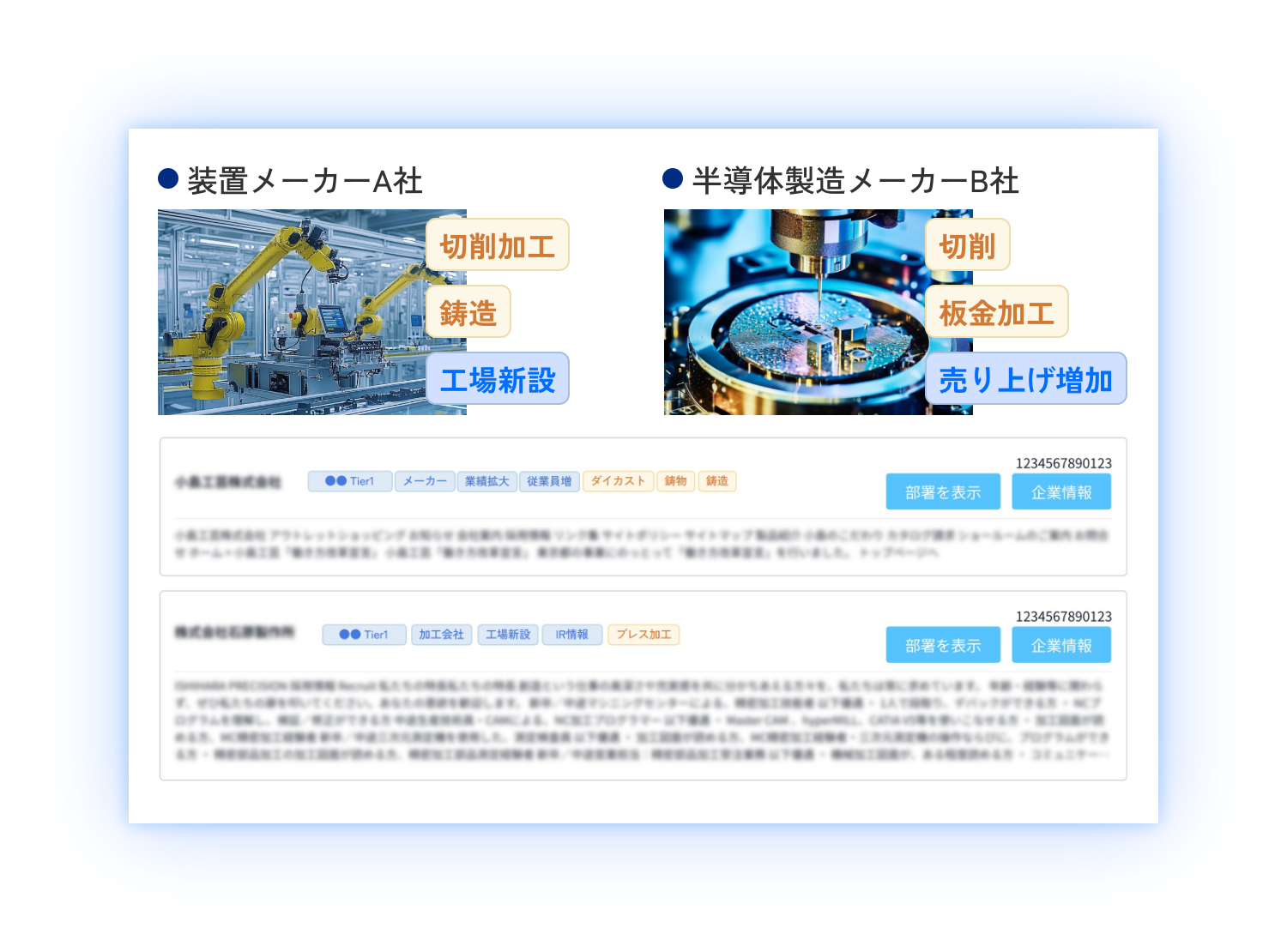 データベースには製造業に特化した180万社の情報を蓄積しており、60万件以上のリサーチタグを活用できます。これにより、業界・エリア・ロットはもちろん、加工方法や材質といった「技術ニーズ」、外注状況や設備投資状況などの「発注ニーズ」まで、より高精度な絞り込みが可能です。