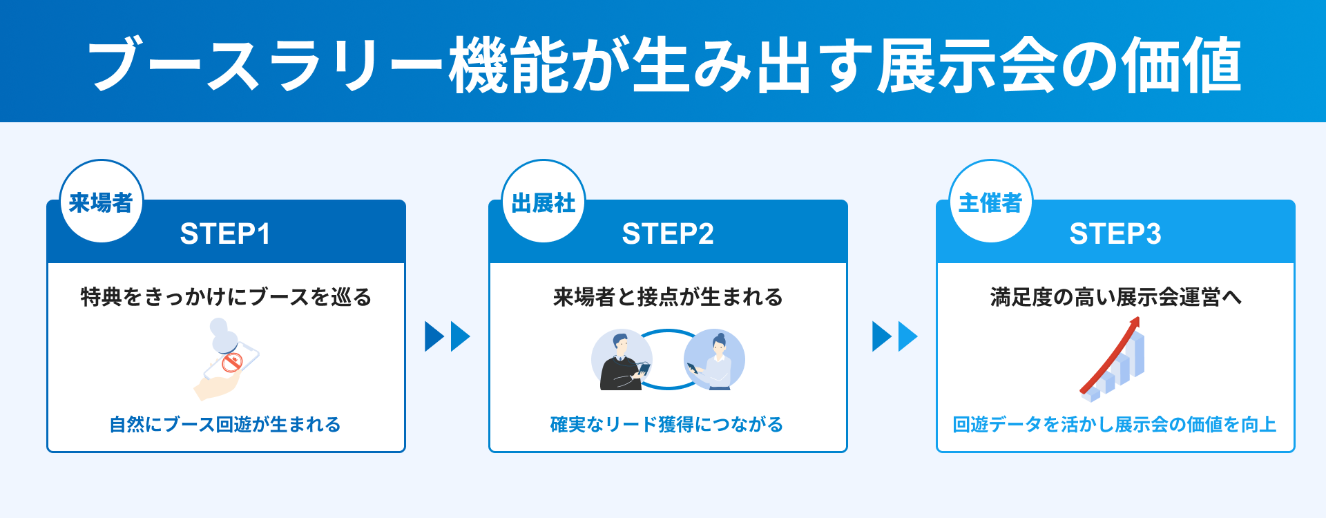 ブースラリーは、来場者が自然と多くのブースを訪問したくなる仕組みを提供し、来場者と出展社のマッチングを促進することで展示会全体の効果を高める回遊促進システム です。