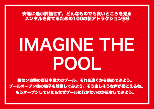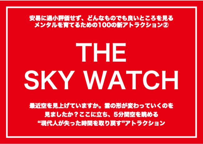 5分間空を眺め“現代人が失った時間を取り戻す”「THE SKY WATCH」や、突然スクワットをはじめて羞恥心も鍛える「突然スクワット」、西日本最大のプールを遠くから眺めてプールオープン後の様子を想像する「IMAGINE THE POOL」スマホから目を離し観覧車の中の人数を数える「ゴンドラ視力検査」など、過ごす時間のマインドを少し変えるだけで姫センの楽しみ方が変わる新企画です。