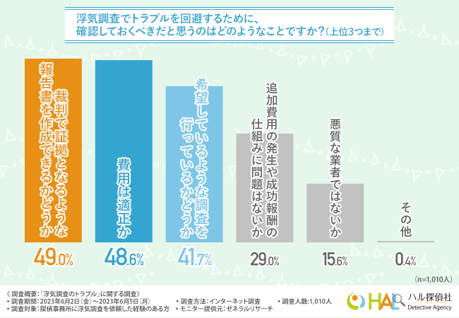 「浮気調査でトラブルを回避するために、確認しておくべきだと思うのはどのようなことですか?(上位3つまで)」と質問したところ、『裁判で証拠となるような報告書を作成できるかどうか(49.0%)』という回答が最も多く、次いで『費用は適正か(48.6%)』『希望しているような調査を行なっているかどうか(41.7%)』『追加費用の発生や成功報酬の仕組みに問題はないか(29.0%)』と続きました。