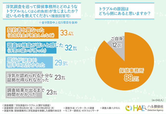 そこで今回、浮気・不倫調査や結婚信用調査、素行調査などを行う『HAL探偵事務所』(https://hal-tanteisya.com)は、探偵事務所に浮気調査を依頼した経験のある方を対象に、「浮気調査のトラブル」に関する調査を実施しました。