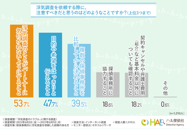 「浮気調査を依頼する際に、注意すべきだと思うのはどのようなことですか?(複数回答可)」と質問したところ、『浮気調査のことがパートナーに気付かれないようにすること(53.7%)』と回答した方が最も多く、次いで『目的や希望をはっきりと伝えること(47.7%)』『複数の探偵事務所を比較してから決めること(39.5%)』『探偵事務所に協力すること(18.6%)』と続きました。