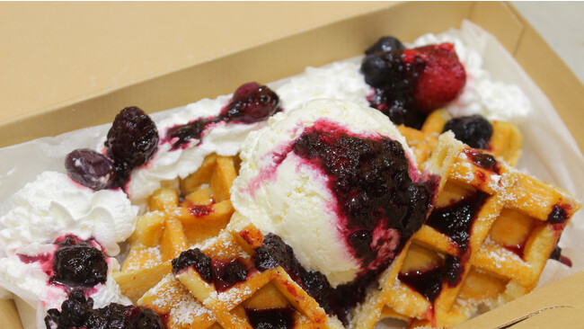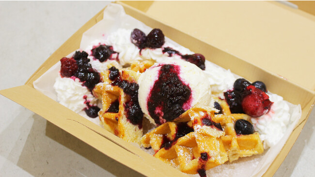 箱を開ければそこにはワッフルにつめたーいスタチアイスをトッピングした、至福の一品が。