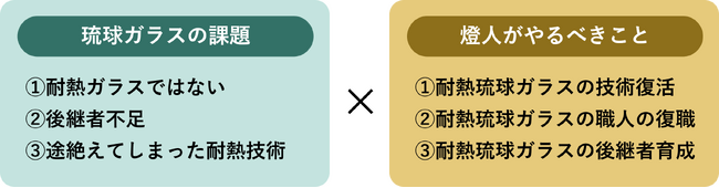 多くの課題を乗り越え、やっとの思いで商品開発を行なった「耐熱琉球ガラスのオイルランタングローブ(ホヤ)」が職人の担い手不足により頓挫すると同時に、耐熱の琉球ガラスをつくるための原料の調合や高い加工技術も途絶えることになりました。