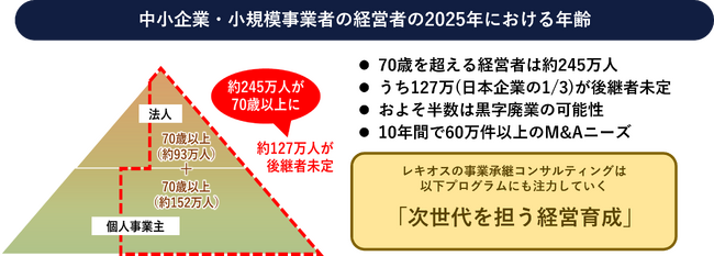 日本では2025年までに平均引退年齢の70歳を超える中小企業の経営者がおよそ245万人おり、そのうちの127万人程度に後継者がなく廃業の危機に直面しており、休業や廃業、解散した企業は年々増え、およそ半数は黒字だというデータもあります。優れた技術や製品をもっていながら、後継者がいないために会社を閉じるという事では日本にとっても大きな損失です。経営を次世代にバトンタッチしていくことが地域の活性化につながっていくはず。そこで、私たちは次世代を担う人材育成を見据え、「物事の本質」と「実践力」を身につけることを目的とした経営者育成プログラムを構築し、多様な分野の人材が主体的に社会問題の解決に取り組み、多くの仲間達とより良い社会を創造できるよう、事業継承コンサルティングに注力します。