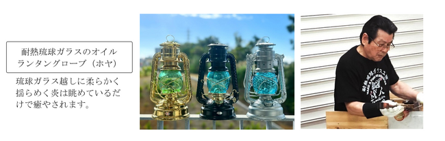 通常の琉球ガラスは、熱に弱く割れやすいため、オイルランタンの火を囲うグローブ(ホヤ)として耐熱の琉球ガラスを起用した製品は全国でも初めて。構想から足掛け3年、コロナ禍の影響による工房の閉業や後継者不足により一度は途絶えてしまった技術が事業継承支援により、復活いたします。