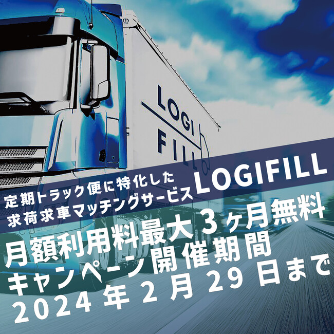 定期便案件にフォーカスした求荷求車(求貨求車)マッチングサイト「LOGI FILL(ロジフィル)」を営む株式会社LOGIFILL(本社:神奈川県茅ヶ崎市)は、2024年1月9日(火)から開催している「LOGIFILL」の月額利用料金5,000円(税別)が【最大3ヶ月間無料】となる「50社突破記念キャンペーン」について、好評につきキャンペーン終了日を当初の2024年1月31日(水)から2024年2月29日(木)に延長することを決定しました。