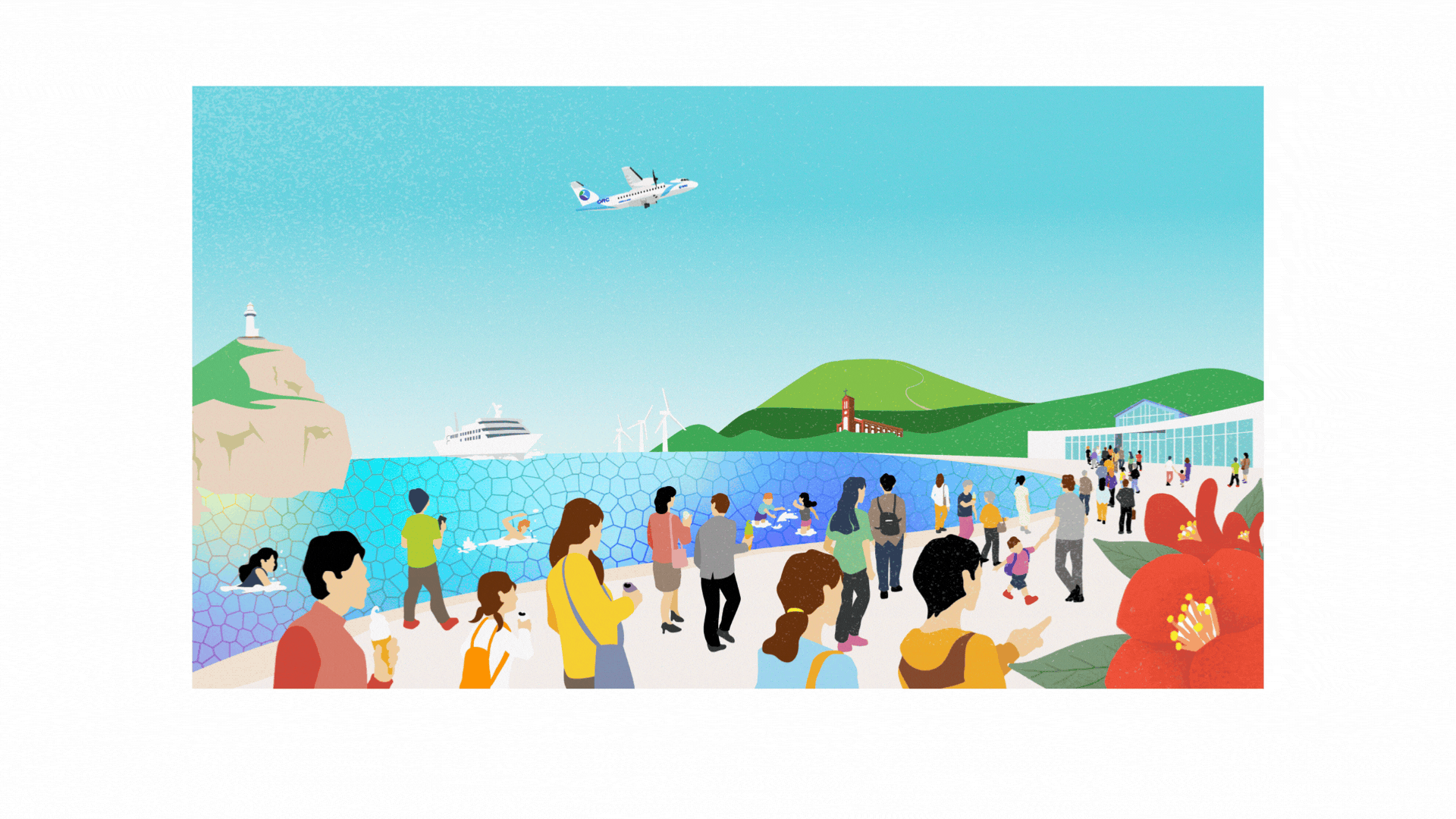 イラストを基調とした親しみやすく思想的なトーンで、観光地ではなく「これから始まる何かの前景」を描き、にぎやかすぎず静かに期待が漂うような空気感を重視。