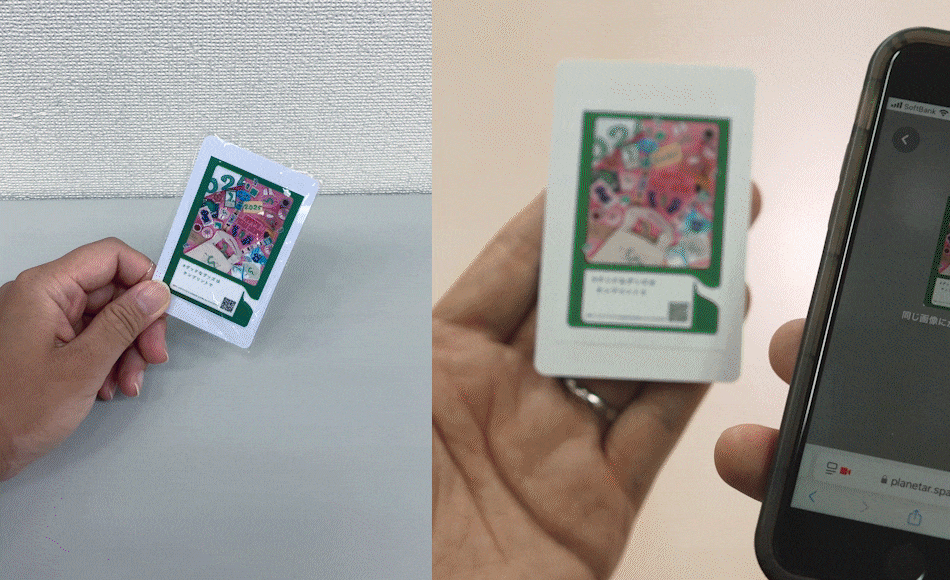 スマートフォンで専用カードにタッチ(画面左)すると、ARシステムに遷移し、カードに印刷された画像を認識することでARが起動(画面右)します。QRコードを使わずにAR体験ができる「QRレスAR」カードタイプ商材となります。