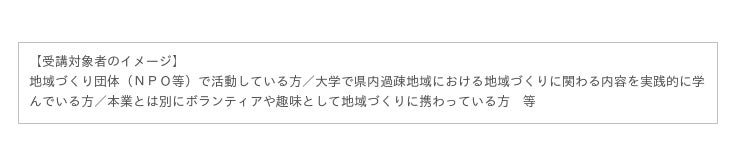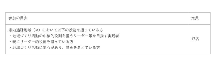 上記<参加対象>に該当し,講座の全カリキュラム(成果報告会含む)を受講できる見込みのある者。なお、県内過疎地域に居住していることは必須の要件とはしません。