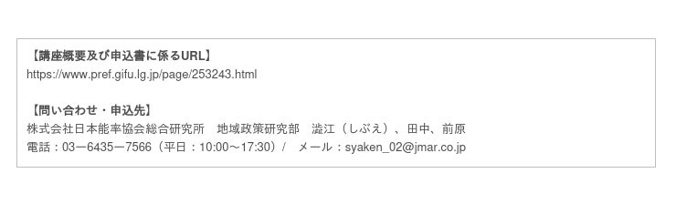 株式会社日本能率協会総合研究所は、岐阜県より「過疎地域における地域リーダー育成事業」を受託し、2022年11月29日(火)から2023年3月7日(火)まで、全7回にわたり、岐阜県(清流の国推進部市町村課)主催の過疎地域リーダー育成講座「ぎふ・地域づくりクエスト(通称:ぎふクエ)」を同県過疎地域で地域づくり活動に取り組んでいる方やご関心ある方を対象に開講します。