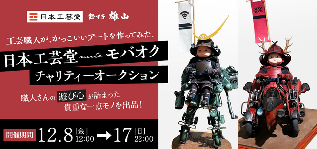 日本工芸株式会社(本社:東京都渋谷区、代表取締役社長:松澤斉之)の展開する工芸品のセレクトショップ日本工芸堂は、インターネットフリマ・オークションサービス「モバオク」にて「『工芸職人が、 かっこいいアートを作ってみた。』日本工芸堂meetsモバオクチャリティーオークション」を12/8-17に開催。鈴甲子雄山による五月人形や鎧兜をテーマにした歴史的アート作品が出品され、12/15まで東京神谷町の「CoCo JAPAN」で展示されます。出品商品を含む鈴甲子の作品を展示。このイベントは工芸職人の遊び心溢れる作品を通じて、彼らの挑戦を応援し、多くの人々に新しい工芸の魅力を広めることを目指しています。