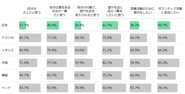 日本財団が調査した2022年に出た『18歳意識調査』によると、『自分の行動で、国や社会を変えられる思う』という項目において、26.9%と6カ国中最下位となりました。