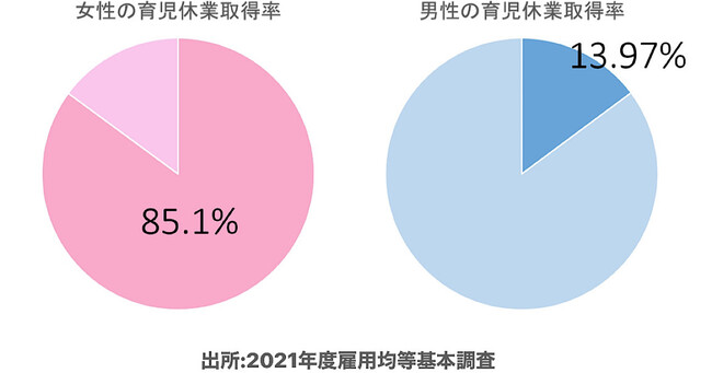 2019年10月1日から2020年9月30日までの1年間に配偶者が出産した男性のうち、2021年10月1日までに育児休業を開始した者の割合は13.97%という結果に。男女ともに休業制度の取得率はあがっているものの、男性の取得率が低いことが分かります。