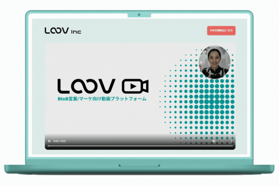 「LOOV」は、BtoBの営業、マーケティング活動の成果を向上させるための「動画ツール」です。普段、皆さんが活用しているPDF等の資料と、PCのインカメラで簡単に動画を録画し、視聴相手に合わせて動画が変化する「インタラクティブ動画」を簡単に作成し利用することが出来ます。
