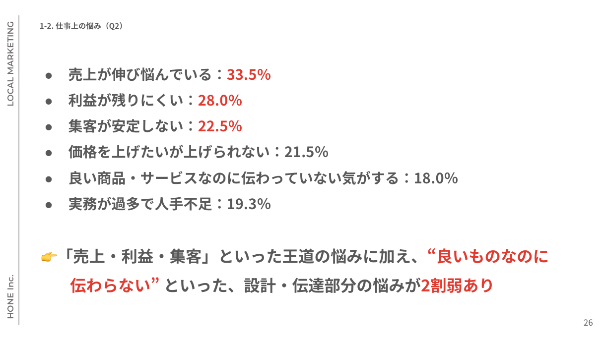 「売上・利益・集客」といった王道の悩みに加え、“良いものなのに伝わらない気がする” といった、設計・伝達部分の悩みが2割弱あり