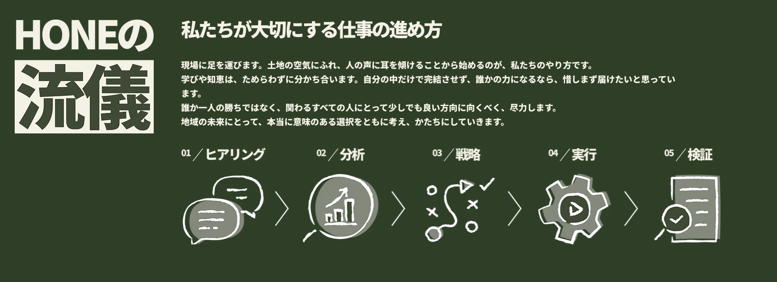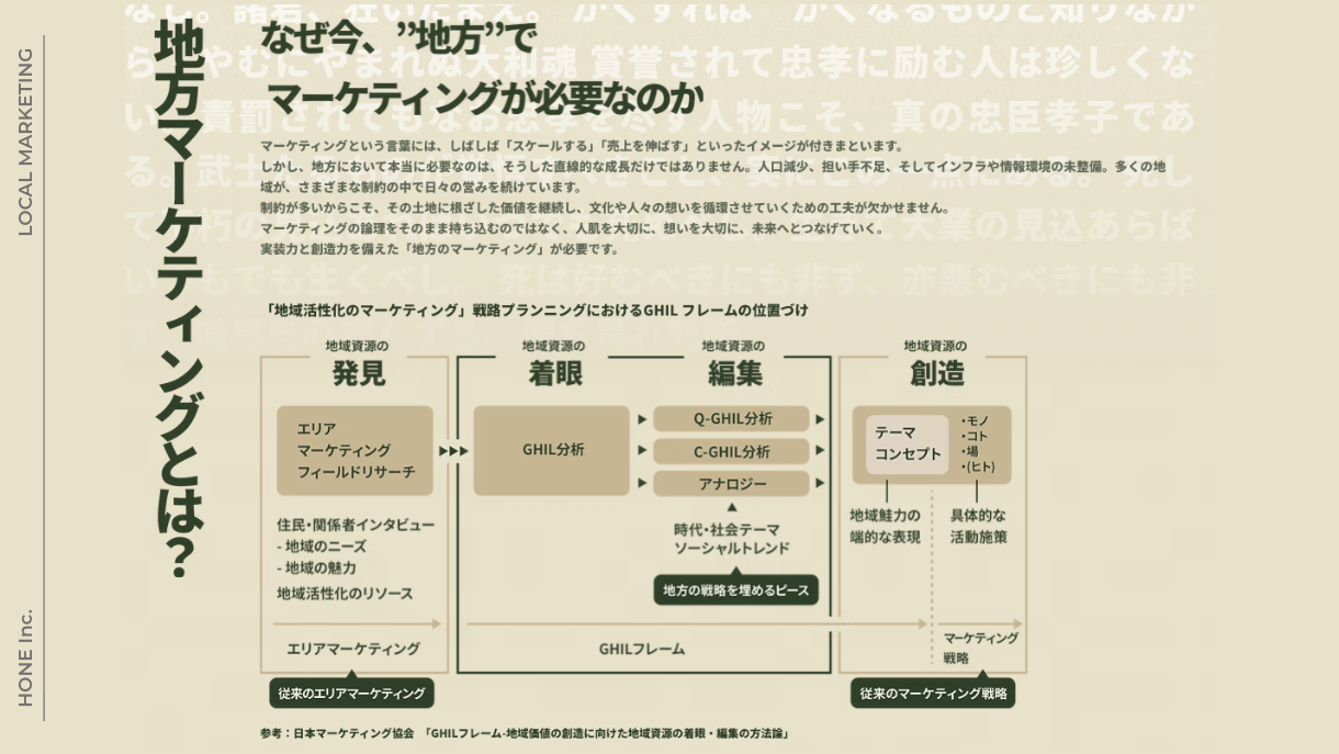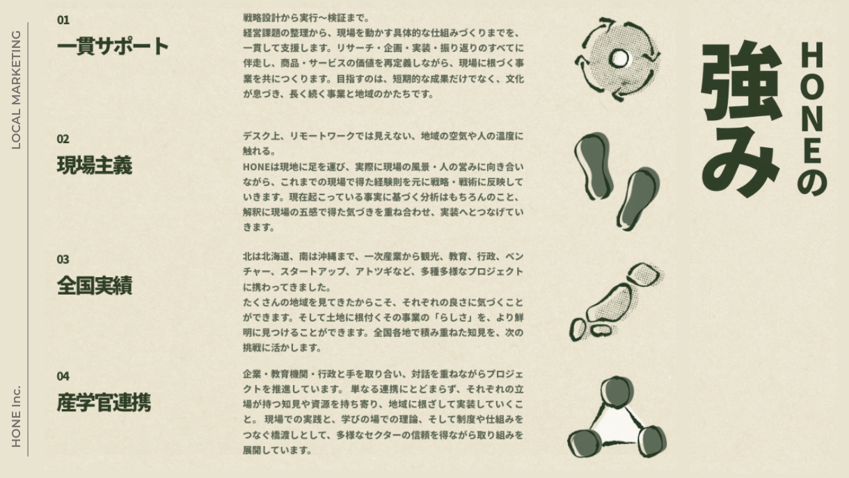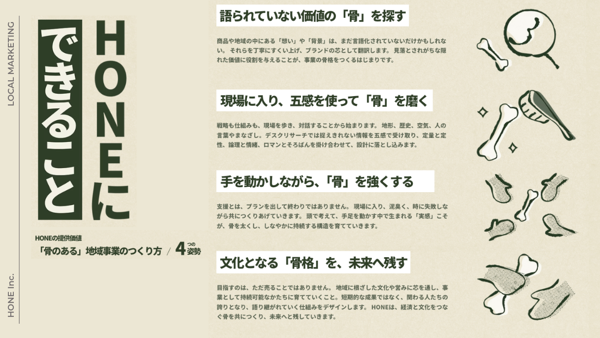 日本の地方には、魅力的な商品・サービスがたくさんあります。地方に根ざしたブランドの志や文化、人々の誇りや営み。HONEはそうした人たちの想いを価値に変えるべく、現地に出向いてきました。 私たちは、文化と経済の「骨」を設計し、地域の「らしさ」を未来へつなげる仕組みを育てます。 論語と算盤。想いと仕組み。美学と実行力。 その両立を、マーケティングの力で実装していきます。[画像15: https://prcdn.freetls.fastly.net/release_image/128884/10/128884-10-f563144f727028a419a666068a61609e-1587x577.png?width=536&quality=85%2C75&format=jpeg&auto=webp&fit=bounds&bg-color=fff ]