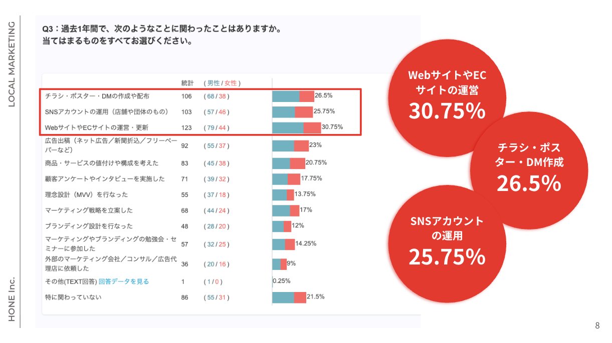 地方に骨のあるマーケティングを実装する株式会社HONE(本社:静岡県静岡市、代表:桜井貴斗)は、全国のマーケティング従事者(現在マーケティング業務を行なっている会社員・フリーランス・経営者)、総勢400名にマーケティングに関する実態調査についてアンケート実施いたしました。