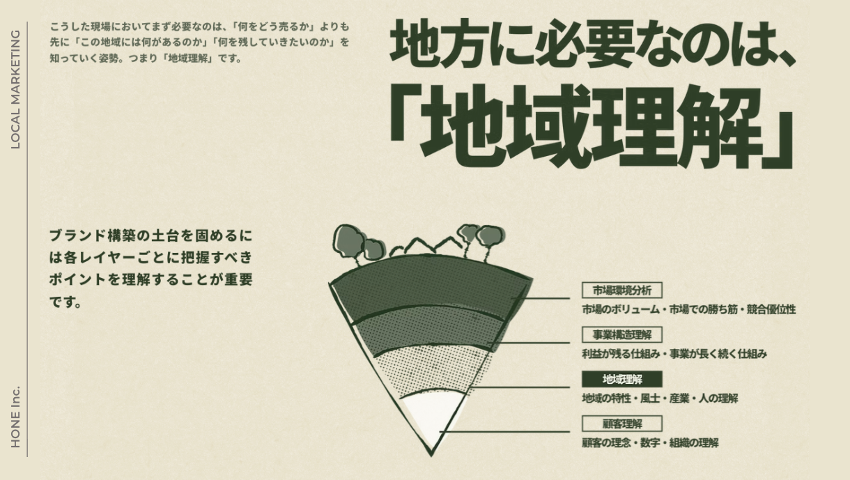 こうした現場においてまず必要なのは、「何をどう売るか」よりも先に「この地域には何があるのか」「何を残していきたいのか」を知っていく姿勢。つまり「地域理解」です。ブランド構築の土台を固めるには各レイヤーごとに把握すべきポイントを理解することが重要です。[画像19: https://prcdn.freetls.fastly.net/release_image/128884/10/128884-10-fdce138405605a760c5a8a859368ec58-1220x689.png?width=536&quality=85%2C75&format=jpeg&auto=webp&fit=bounds&bg-color=fff ]