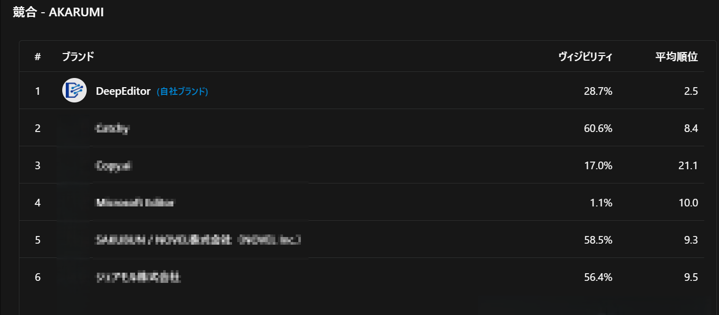 自社と競合のLLM上での露出量や言及文脈、回答への採用率に加え、提示順位まで比較可能です。どのカテゴリで上位を獲得できているか、競合に後れを取っている領域はどこかを明確に把握し、戦略の優先度を正確に判断できます。