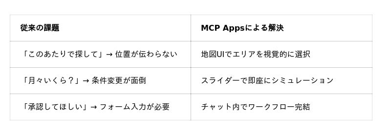 MCP Appsを導入することで、AIチャット上でリッチなUIを提供でき、ユーザーの操作性と満足度が向上します。不動産サービス