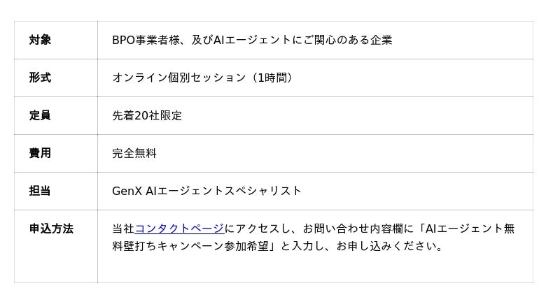 GenXは今回、BPO事業者様をはじめ、AIエージェントにご関心のある企業を対象に「自社の業務にAIを取り込む可能性」を具体的に見極められるよう、AIエージェントのスペシャリストによる1時間の無料個別相談を提供します。[表: https://prtimes.jp/data/corp/165900/table/11_1_638ec22b3b401e13934d4787a91aece7.jpg?v=202603180345 ]
