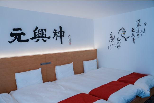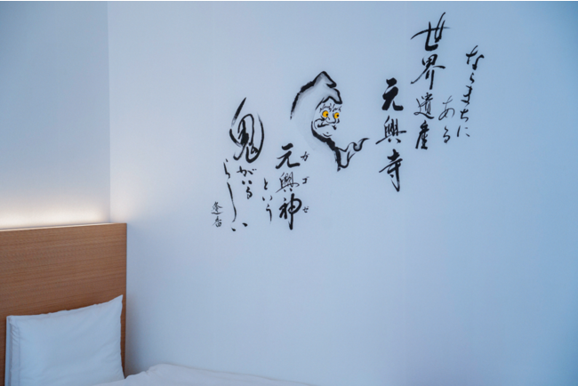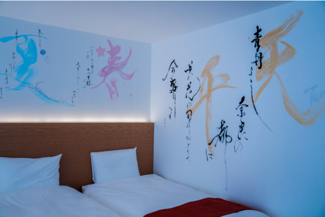 ホテル天平ならまちのコンセプトは「書」。部屋ごとに、ひとつひとつ異なる書の作品が散りばめられています。ただ、客室に書の作品が飾られているのではなく、壁自体が和紙となっており、作者によって直接書が書かれているのです。
