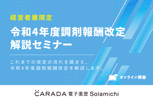 クラウド電子薬歴『CARADA 電子薬歴 Solamichi』の企画・開発・販売を行う株式会社ソラミチシステムは、薬局経営者に向けた無料オンラインセミナー「令和4年度 調剤報酬改定解説セミナー」を、2022年3月26日(土)と3月30日(水)に開催します。