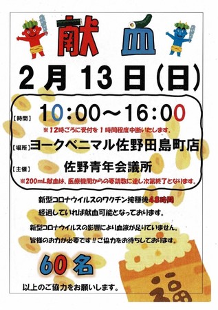 一般社団法人佐野青年会議所(事務局:栃木県佐野市、理事長:渡邉伸一郎)は、毎年開催している献血会を2022年2月13日(日)にヨークベニマル佐野田島店にて開催致しました。