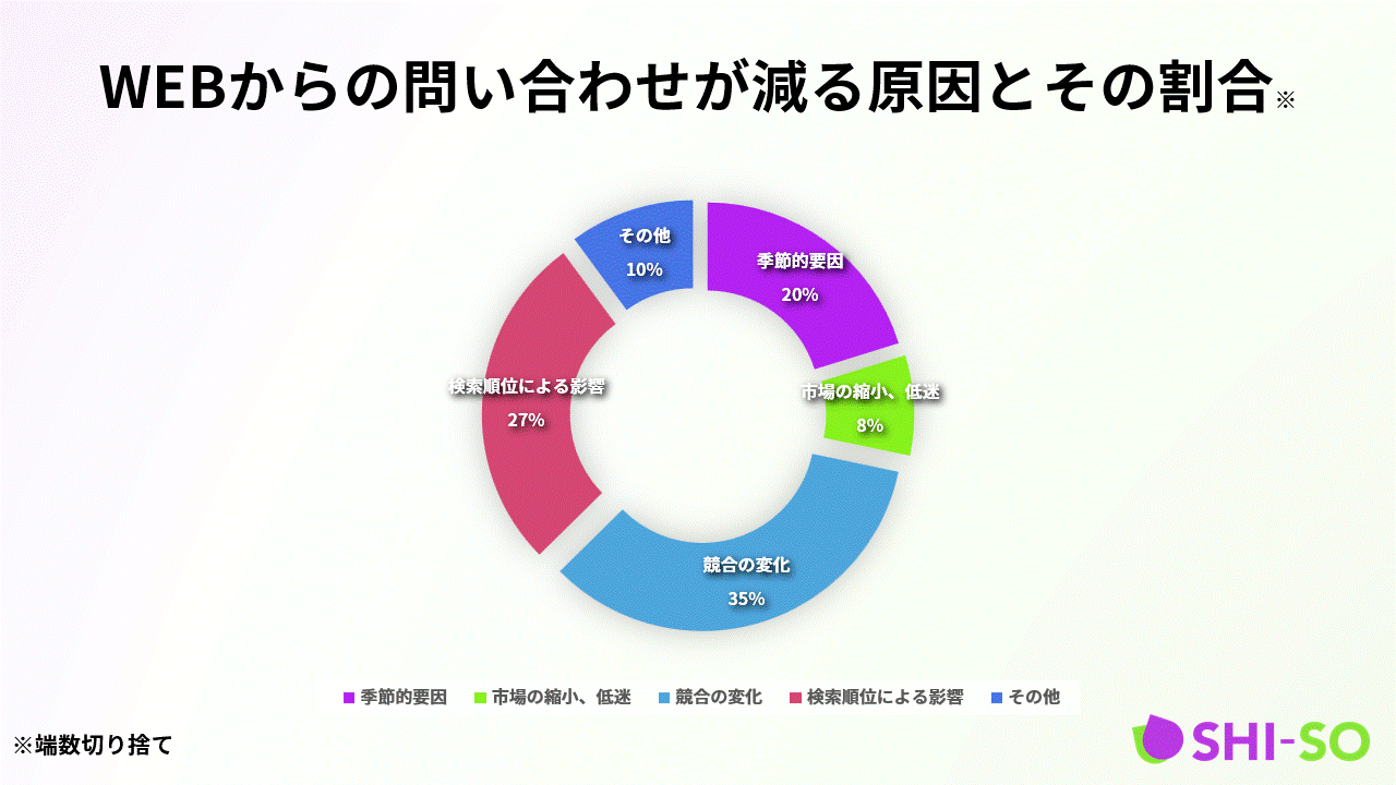 原因の中でも特に、競合の変化(34%)検索順位による影響(27%)により、約半数以上が検索順位に影響を受けていました。