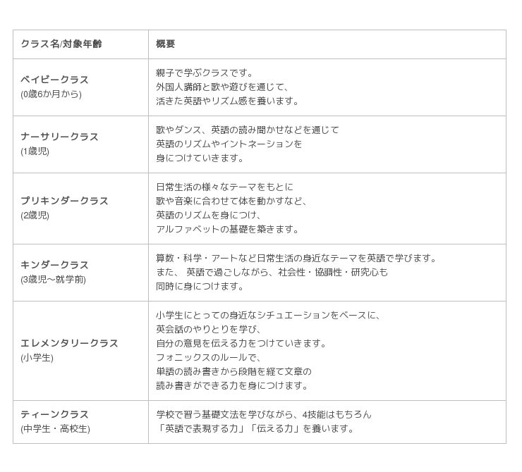 朝から保育士が常駐してお子様をお預かりする「プリスクール」コースと、保育園や幼稚園・学校が終わった後や土曜日にお通いいただく「アフタースクール」コースを用意し、いずれのコースも科目として勉強する英語学習ではなく年齢にあわせた様々なカリキュラム・アクティビティを通し、こどもの創造力を伸ばし好奇心や集中力、協調性を育むことを目指しております。