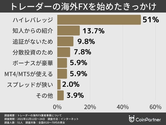 トレーダーが海外FXを始めたきっかけ第1位は、2位と大差をつけて「国内よりもハイレバレッジである事」でした。国内のFX業者は、金融庁のレバレッジ規制により最大25倍となっています。一方で海外FXでは、100倍や500倍は当たり前で、1000倍を超えるレバレッジをかける事すら出来ます。国内のレバレッジ規制は「投資家保護」を目的の1つとしていますが、皮肉ながらもそのレバレッジの低さのせいで海外FXを始める方が多く、またその中でも半分以上の人が損をしています。