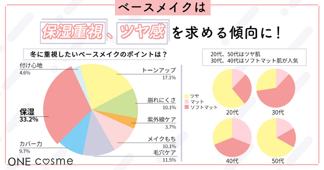 「冬メイクでなりたいorメイクで仕上げたい肌質は?」という質問への回答は、年代によって異なる結果になりました。20代・50代はツヤを、30代・40代はソフトマットを重視する傾向があります。