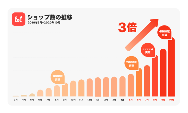 株式会社レット(本社:東京都港区、代表:佐藤 航陽)が運営する、訳あり品のマーケット「Let(レット)」の出店ショップ数が5月以降の6ヶ月間でそれまでの約3倍にあたる「4,512」ショップとなりました。