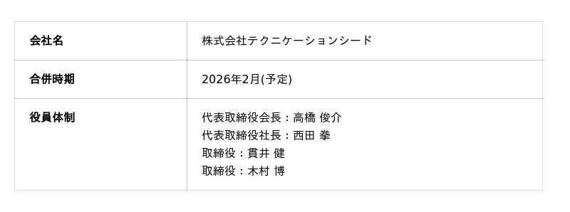 本合併により、両社は2026年2月(予定)をもって、「株式会社テクニケーションシード」に社名を変更いたします。