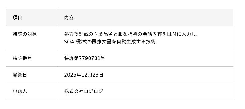 株式会社ロジロジ(代表取締役:山口洋介、以下「当社」)は、当社が提供する生成AI薬歴アシスタント「ピアス」に関する2件目の特許(特許第7790781号)が登録されたことをお知らせいたします。現時点で特許登録済み3件・出願中4件の合計7件の知財ポートフォリオを構築しています。今回取得した特許は、処方箋に記載された医薬品名と服薬指導の会話内容を大規模言語モデル(LLM)に入力し、SOAP形式の医療文書を自動生成する技術に関するものです。1件目の特許(特許第7627976号)に対して、今回の2件目は単一の処方データだけで権利が成立する構成であり、従属請求項においても異なる実装パターンをカバーする幅広い権利構成を実現しています。さらに当社は、本特許から3件目となる分割出願(特願2025-230632)を行い、生成AI活用による医療文章生成技術に関する知財ポートフォリオの拡充を継続してまいります。