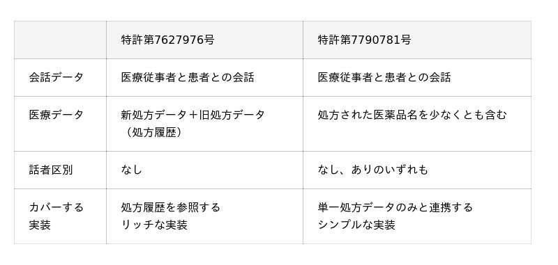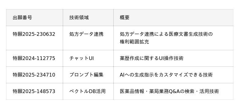 [表1: https://prtimes.jp/data/corp/123307/table/16_1_a04cd1ee22b8ba32ff2b6d4b3b77afe7.jpg?v=202604060415 ]1件目の特許(特許第7627976号)は、会話データ(服薬指導など医療従事者と患者との会話)と医療データ(処方履歴の医薬品データを含む)を学習モデル(大規模言語モデル;LLMなど)に入力し、医療文書(SOAP形式の薬歴など)を生成する技術に関するものです。今回の2件目は、医療データとして処方箋単位での医薬品名と服薬指導の会話を対象とした権利を取得しました。なお、本特許は入力内容と出力内容の対比から当該技術の利用有無を外部から判別しやすい構成としている点も特徴です。