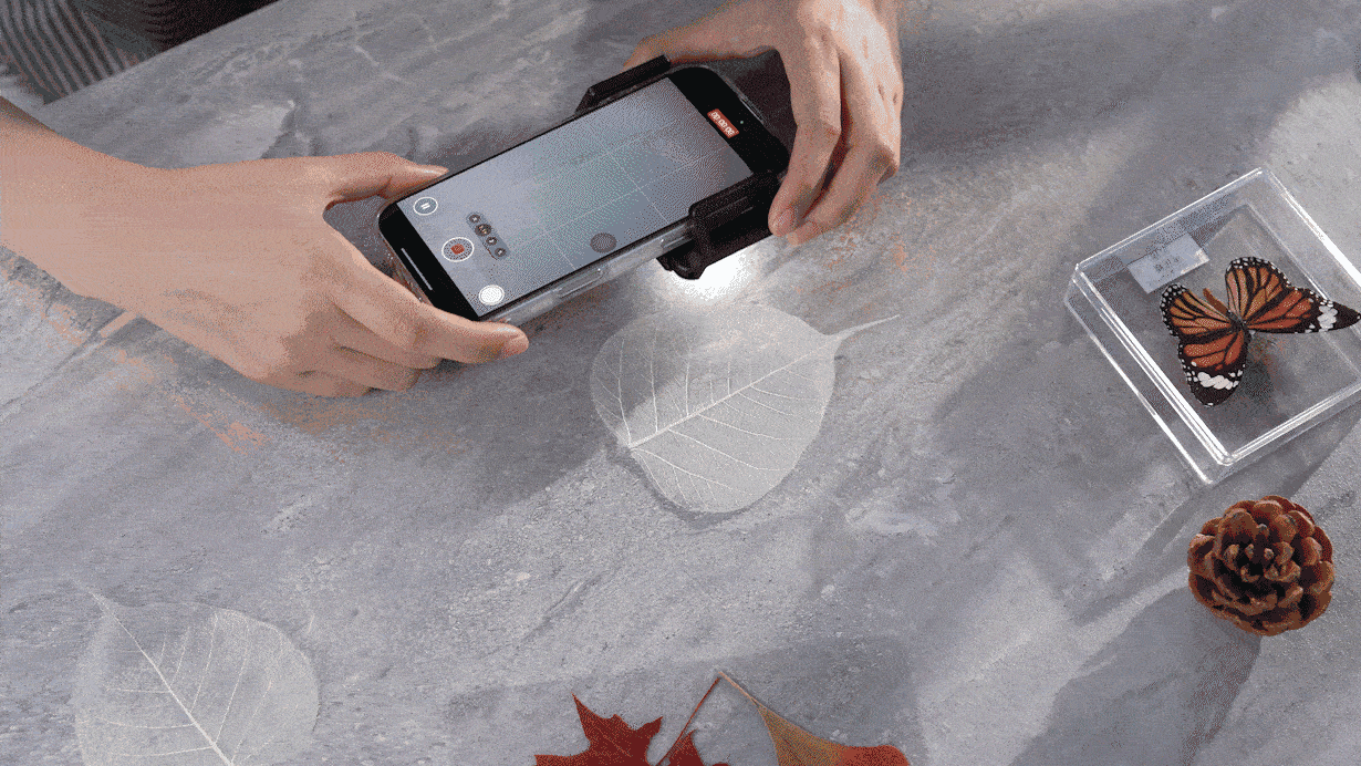 ミクロの世界をより身近にするために、複雑な設定やスマホアプリは一切不要で、子供や初心者にもすぐ扱える仕様となっています。71mmから105mmまで幅広い範囲内で伸縮可能、ほぼ全てのスマホに対応。