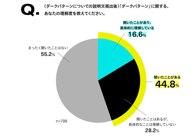 「聞いたことはあるが、具体的なことは理解していない」(28.2%)と合わせると、ダークパターンという言葉を聞いたことがある人は44.8%と半数に迫った。