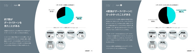 企業や行政と伴走し活動を支えるデザイン会社の株式会社コンセント(本社:東京都渋谷区 代表:長谷川敦士 以下、コンセント)は、消費者をだますウェブサイトやアプリのユーザーインターフェースである「ダークパターン」について、全国18歳から69歳までのECサイトやアプリでの購入経験者799人を対象に、見たりひっかかったりした経験やその際に取った行動、認知・理解度などの実態を調査し、「ダークパターンレポート2023」としてとりまとめました。