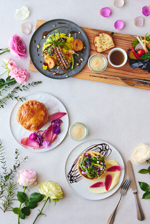 レストランの離れにあるプライベートな空間で、大切な人と特別な時間を過ごせるランチプランが期間限定で新登場。3種類の季節のメインから選べるランチプレート[束]に、ウェルカムドリンクのバラのサイダーと特製デザートプレート、さらにはお持ち帰りできるミニブーケが付いて、お祝いシーンにもぴったり!豊かな自然に囲まれた空間で、新たな出会いと出発を彩るリラックスしたひと時をお過ごしください。