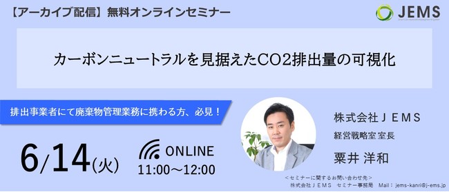「ITで環境問題に挑む」をコーポレートスローガンに掲げる株式会社JEMS(本社:茨城県つくば市、代表取締役:須永裕毅)は、2022年6月14日(火)に排出事業者の廃棄物管理担当者様向けに、廃棄物処理にかかるCO2排出量の可視化を解説する無料オンラインセミナーをアーカイブ配信します。