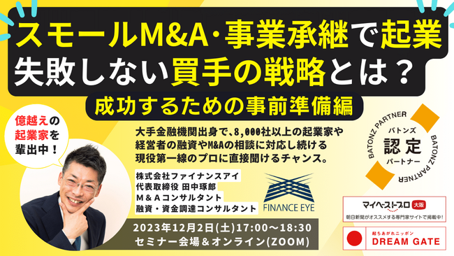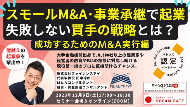 株式会社ファイナンスアイ(本店:大阪府大阪市、代表取締役:田中 琢郎。以下、ファイナンスアイ)は、スモールM&Aや事業承継で起業・副業・新規事業の立上などを考えている方に向けて、『個人もスモールM&A・事業承継で起業!失敗しない買手の戦略とは?M&Aの実行編』と題してセミナーを開催します。政府も後押しするM&Aによる事業承継は、ゼロイチから起業するよりも低リスクで事業を開始して、早期の収益化を目指せます。コロナ禍以後の新時代の起業戦略の一つと考えられます。しかし、いざスモールM&Aや事業承継を考えた時、一体何から始めたら良いのか?ゼロイチで起業をする時も、市場のリサーチやビジネスモデルの設計や資金調達など入念な事業計画を立てます。スモールM&Aや事業承継でも同様に事前準備が重要です。しかし誰に相談すれば良いのか?スモールM&Aに特化しているというM&Aコンサルタントでも最低報酬は数百万円〜というのが相場です。今回のセミナーでは、12月2日開催の事前準備編に続くM&Aの実行編として、スモールM&Aや事業承継を実行する人に向けてお伝えします。