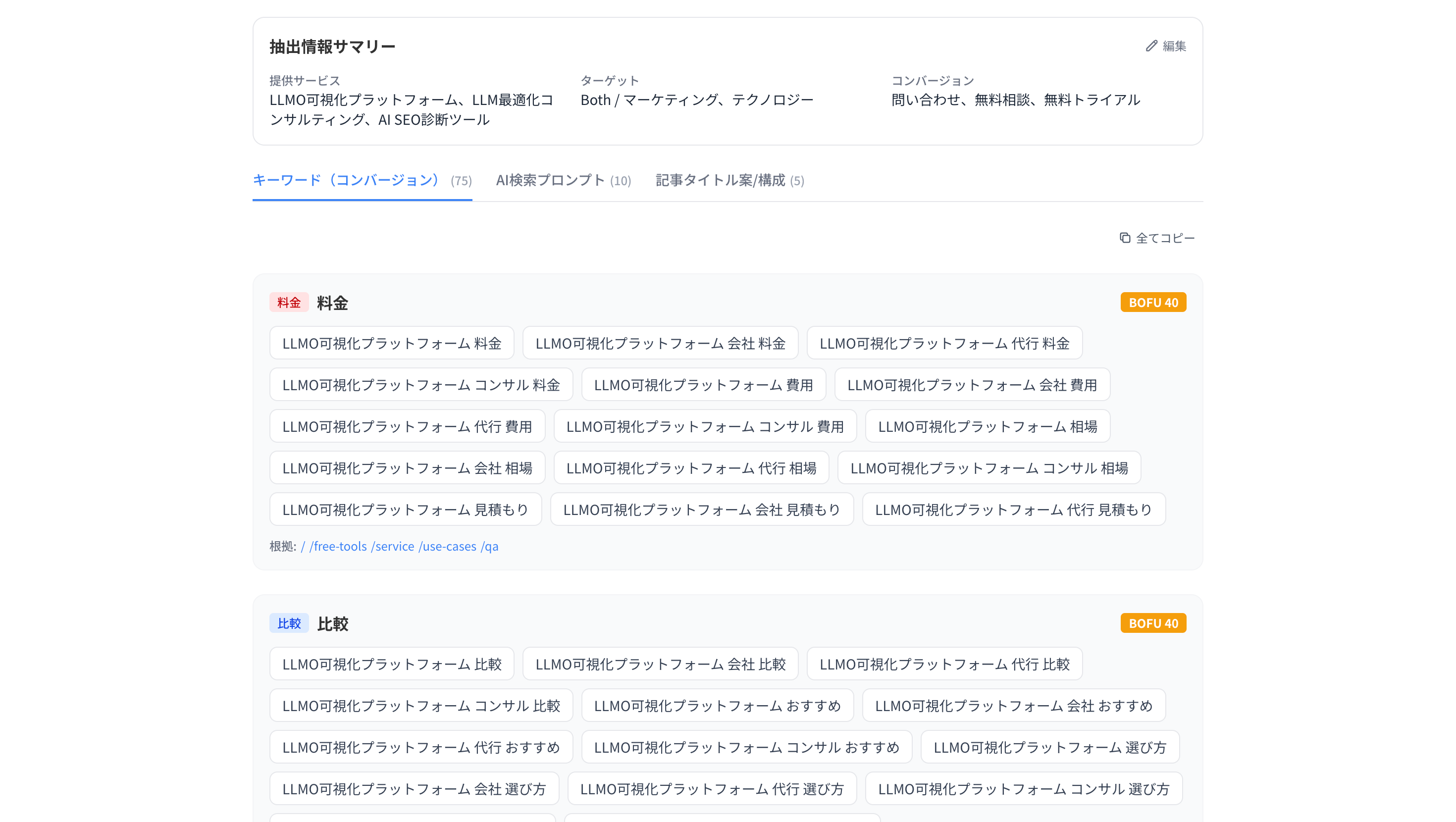 本ツールは、入力URLを解析し、サービス内容・提供価値・ターゲット・コンバージョンポイントを抽出。問い合わせ・比較・検討段階で使われる検索語を自動生成します。