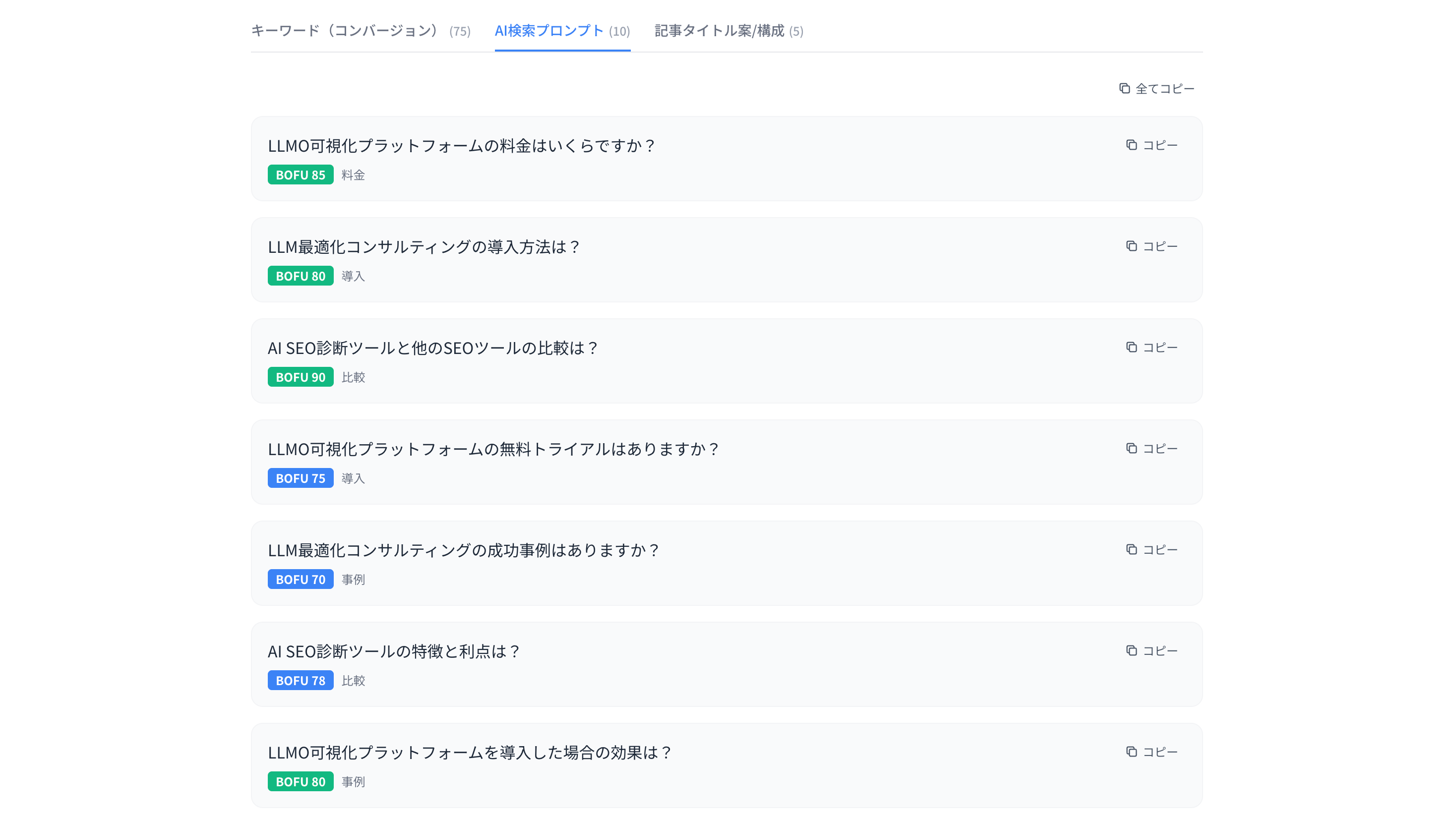 本ツールは、LLMO(Large Language Model Optimization)およびSEOの実データをもとに、売上・問い合わせ・商談につながる意思決定層の検索意図のみを抽出。ChatGPT・Gemini・Google AI Overviews などのAI検索において引用・推薦されやすい質問構造を設計し、AI時代のコンテンツ戦略を支援します。