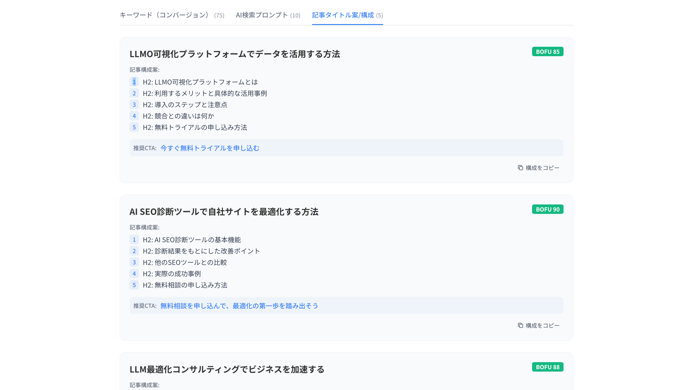 記事タイトル案・構成生成画面